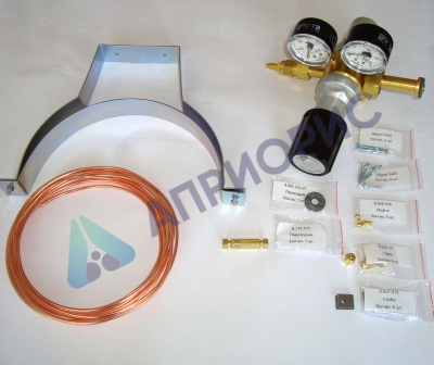 Комплект включает в себя двухступенчатый баллонный регулятор давления 5.882.003, медный трубопровод, а также комплектующие, необходимые для установки баллона и монтажа трубопровода до хроматографа. Полный перечень элементов, входящих в комплект, приводится ниже.