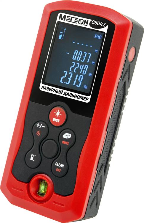 Лазерный дальномер МЕГЕОН 06042 предназначен для быстрого и точного измерения расстояния до объекта, вычисления площади и объема помещений, а также для измерения длин недоступных участков по теореме Пифагора. Оснащен набором математических расчетов. Вычисляет минимальное и максимальное измеренное расстояние. Обладает функцией памяти. В лазерный дальномер встроен пузырьковый уровень и крепление для штатива для более точного позиционирования и измерения. Имеет встроенный лазерный целеуказатель. Корпус прибора выполнен в противоскользящем исполнении, а благодаря небольшим размерам и эргономичной форме, прекрасно лежит в руке. Прибор получил двухцветный корпус с защитой от проникновения внутрь пыли и брызг воды. Благодаря применению специальной схемы увеличено время работы от батареек или аккумулятора.