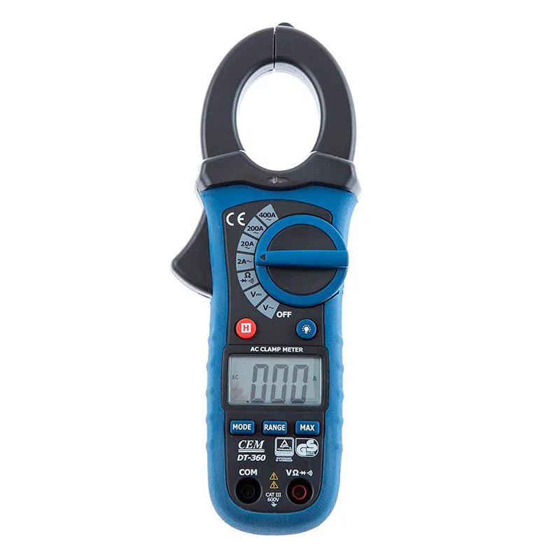Токоизмерительные клещи DT-360 снабжены большим дисплеем с подсветкой и фонариком для работы в темных местах. Они обладают функцией удержания показаний и определения максимальных значений. Уровень заряда батареи отображается на экране, чтобы не забыть заменить батарею. Кроме того, эти клещи оснащены функциями прозвонки цепей, диодного теста и определения сопротивления до 20 MОм.
