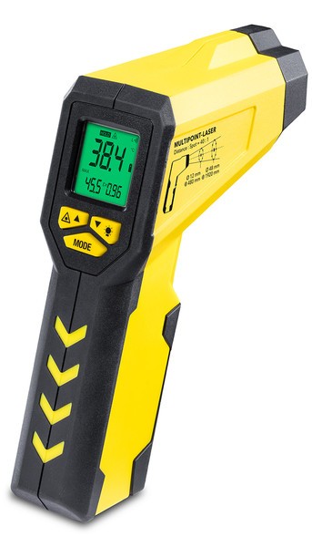 Многолазерный пирометр с широким диапазоном температур и уникальным запатентованным дизайном разработанным в Германии, имеет информативный дисплей с цветовой подсветкой, которая меняет свой цвет в зависимости от заданных пользователем предельных порогов значений температур.