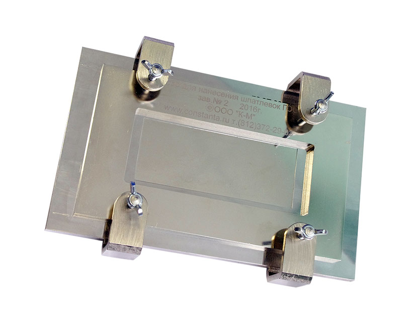 Устройство состоит из основания с фиксирующими винтами и прижимной стальной рамки. Испытательную пластинку с размещенным на ней аппликатором для шпатлевок установить между основанием и прижимной рамкой и зафиксировать винтами. С помощью шпателя заполнить отверстие шпатлевкой до верхней плоскости аппликатора, снимая избыток. В соответствии с методиками стандартов или нормативной документации провести испытания..