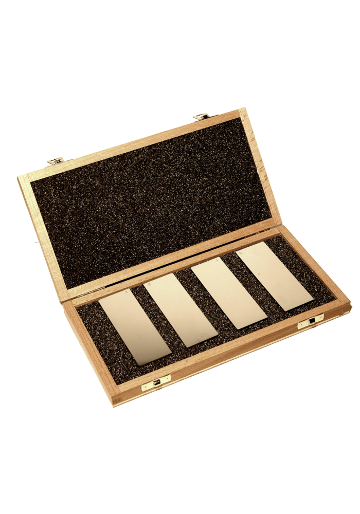 Используется для определения чувствительности флуоресцентных и контрастных пенетрантных систем. Состоит из четырех тест панелей, представляющих собой бронзовые пластины 100х35х2, покрытые NiCr-слоем со следующей толщиной покрытий: 10 мкм, 20 мкм, 30 мкм, 50 мкм. В NiCr-покрытии изготовлены поперечные трещины, глубина которых соответствует толщине NiCr-покрытия.