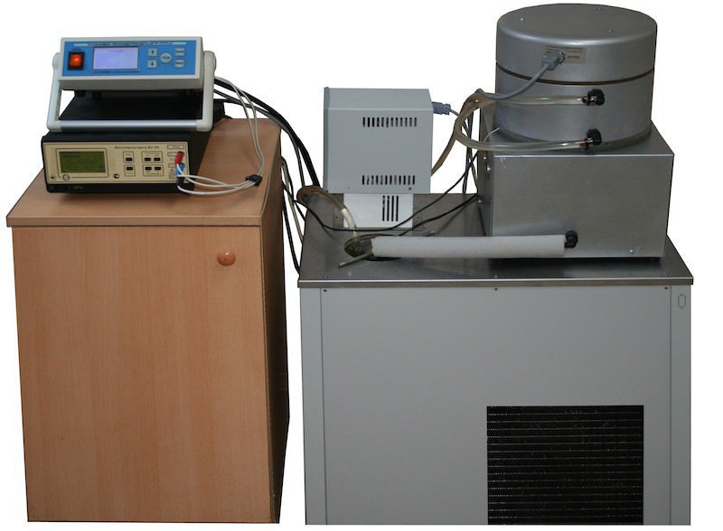 Создание и автоматическое поддержание стационарного и равномерного теплового потока заданной плотности в теплометрическом блоке обеспечивается за счет поддержания постоянной разницы температур верхнего нагревателя, температура которого задается и стабилизируется блоком управления, и нижнего холодильника, температура которого определяется теплоносителем, циркулирующим от термостата (поставляется по спецзаказу). Площадь рабочей зоны теплометрической камеры позволяет поверять одновременно до 18 датчиков теплового потока.