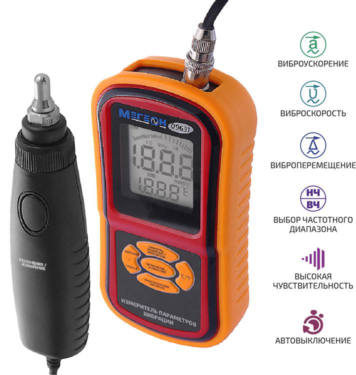 МЕГЕОН 09631 измеритель параметров вибрации с выносным датчиком. Программное обеспечение имеет функцию автоматической температурной коррекции, что позволяет увеличить точность измерения. Компактный, надежный и простой в эксплуатации прибор разработан для промышленного и исследовательского использования. Принцип работы основывается на пьезоэлектрическом эффекте в искусственно созданной поляризованной керамике. Изделие обеспечивает прецизионность измерений и контроль за уровнем возвратно-поступательных движений в различных механизмах, устройствах и движущихся элементов. Используя данный прибор, Вы сможете измерять виброскорость, виброускорение и амплитуду колебаний. В комплекте поставки предусмотрены несколько видов наконечников, специально предназначенных для проведения замеров в труднодоступных местах и на металлических поверхностях. Оборудование без сомнения найдет применение в промышленности и быту.
