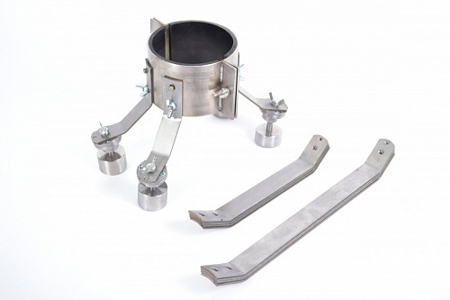 Одним из вариантов размещения рентгеновских аппаратов на объектах проведения радиационного контроля являются крепежные приспособления серии «Паук-2М», изготавливаемые согласно утвержденной нормативной документации – ТУ 4276-020-96651179-2015. В конструкцию крепежных приспособлений входит четыре ноги, магниты мощного действия и сам держатель для оборудования. Исполнение держателя зависит от модели используемого в работе рентгеновского аппарата и выполняется в виде или обжимной муфты, или плоского основания. С помощью регулировочного механизма с шаровой головкой и фиксатором барашкового винтового типа на ноги конструкции крепятся магниты, такая конструкция разрешает располагать приспособление с оборудованием на трубопроводах диаметром больше 200 мм. Также применяется и для объектов контроля с полоской поверхностью. В комплект приспособления поставляются сменные ноги различной длины, разная длина ног необходима для регулирования фокусного расстояния при проведении контроля.