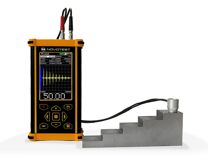 Помимо определения толщины изделия, прибор можно использовать в качестве ультразвукового дефектоскопа, так как на А- развертке возможно отображение сигналов от внутренних дефектов. А функция В-скана позволяет визуализировать профиль контролируемого изделия при сканировании датчиком по поверхности.