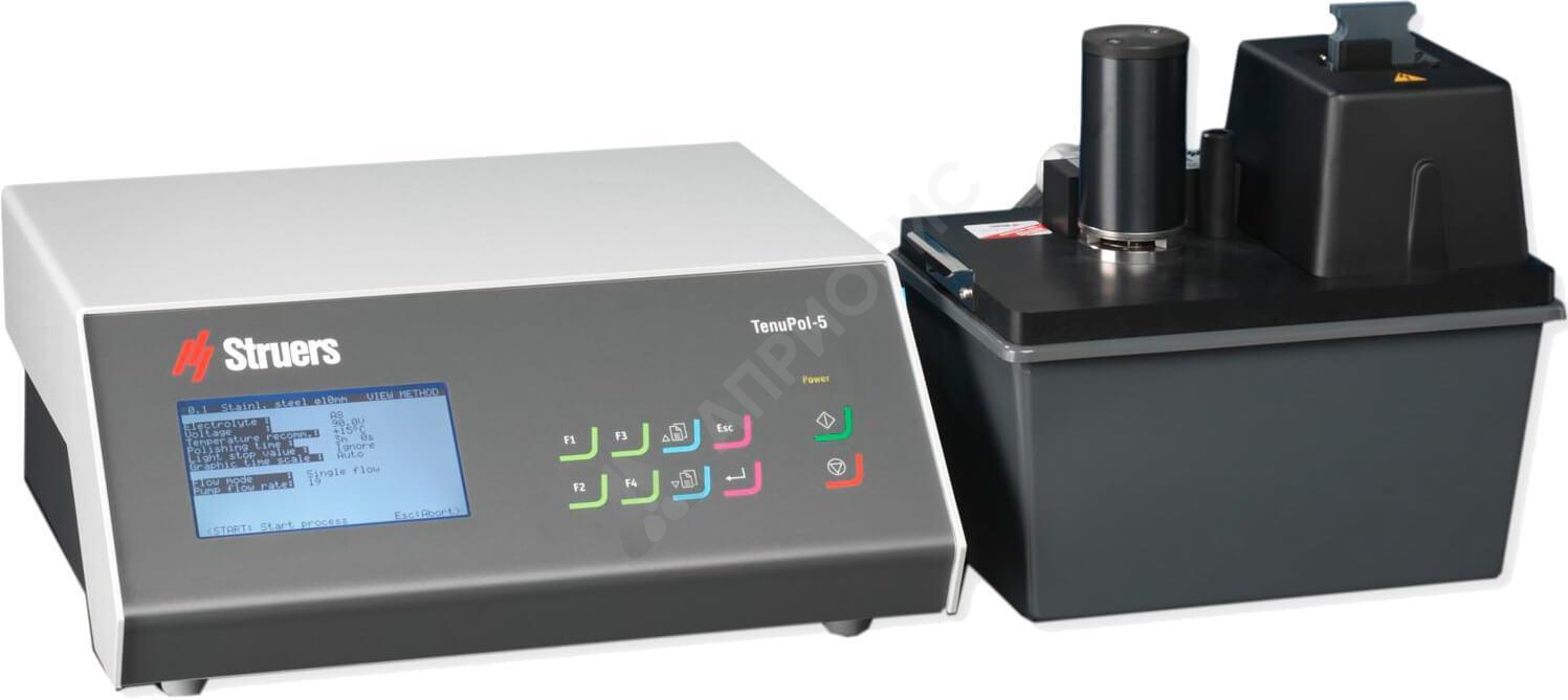 Устройство для автоматического электролитического утонения образцов для просвечивающей электронной микроскопии. При помощи TenuPol-5 можно подготовить перфорированный образец, для просвечивающей электронной микроскопии (ПЭМ) из образца диаметром от 3 до 2,3 мм всего за несколько минут. Образец полируется с обеих сторон одновременно, что обеспечивает минимальную деформацию его структуры. Чтобы избежать механической деформации, большие образцы могут быть предварительно утонены электролитическим способом. Определение требуемых режимов утонения происходит при помощи встроенной функции сканирования. Состоит из двух отдельных блоков: контрольного и блока утонения. Это позволяет устанавливать в вытяжные шкафы (или боксы) только полировальный блок, что в значительной мере экономит место в боксе и упрощает управление процессом утонения.