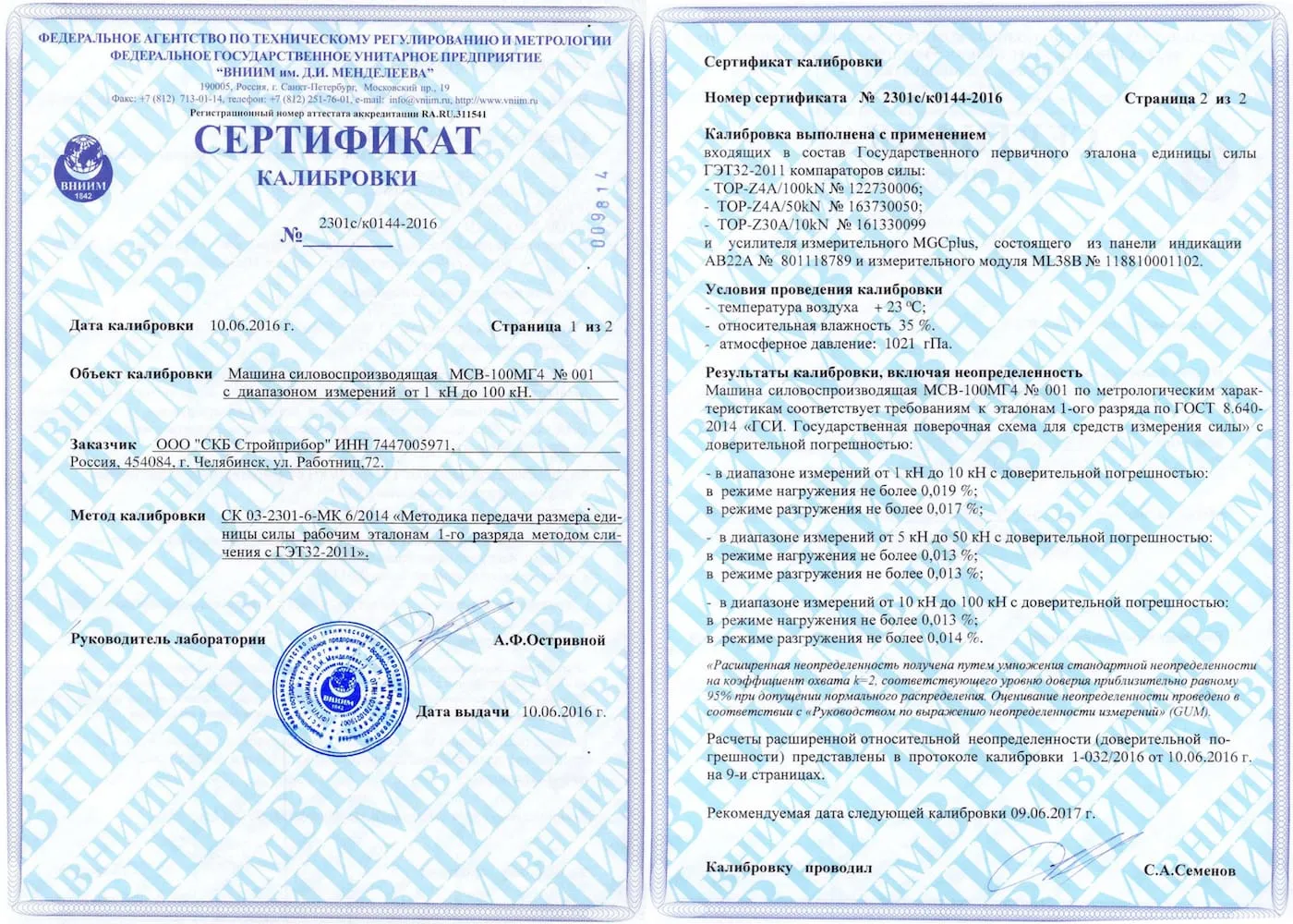 В период с 2015 по 2021гг изготовлено и введено в эксплуатацию в качестве эталона 1 разряда 37 силовоспроизводящих машин с диапазоном воспроизведения силы от 0,2 ... 10 кН до 40 ... 2000 кН, в том числе 24 машины в региональных центрах стандартизации и метрологии.
