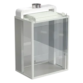 Шкаф состоит из вытяжной камеры, которая устанавливается на рабочий стол. Шкаф оборудован воздуховодом для вытяжки воздуха из рабочей зоны вытяжной камеры. Боковые и задняя стороны рабочей зоны камеры шкафа закрыты стёклами.