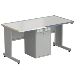 Стол состоит из столешницы, металлического каркаса и металлического короба - сервисной стойки (тумбы).