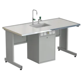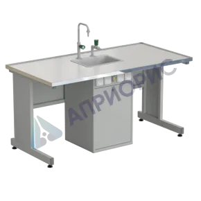 На сервисной стойке стола размещены четыре розетки для подключения электрооборудования и устройство защитного отключения (УЗО). Стол оснащен стеклопластиковой раковиной, кранами для воды и сантехнической разводкой.