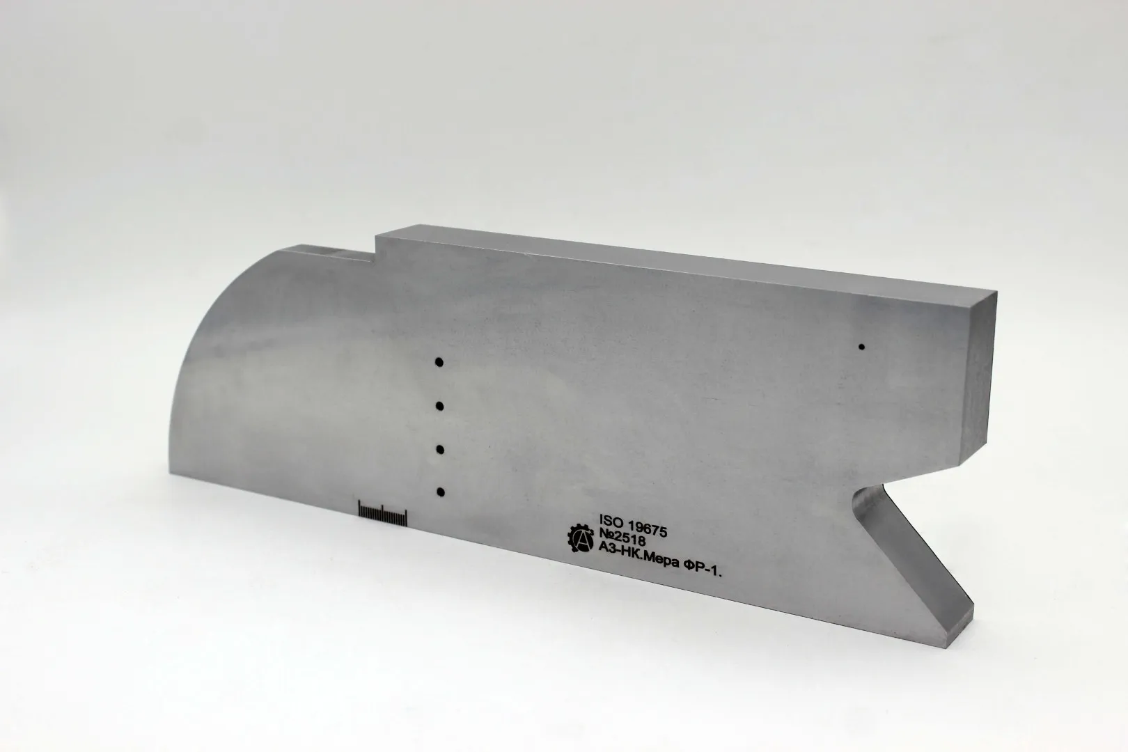 Меры ФР-1 представляет собой изделие в виде параллелепипеда, с цилиндрическими сквозными отверстиями на боковой поверхности, служащие отражателем ультразвуковых волн. Мера ФР-1 имеет радиусную часть (скругленный угол). На боковой поверхности меры нанесены шкалы, необходимые для определения параметров ввода ультразвуковой волны.