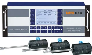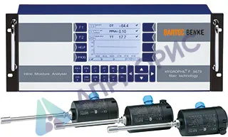 Принцип действия анализаторов влажности HYGROPHIL F 5673 (далее -анализаторы) основан на спектрометрическом методе измерения влажности, заключающемся в определении степени поглощения светового луча известной длины волны, проходящего через слой микропористого прозрачного сорбента, адсорбирующего молекулы воды из анализируемой среды. Анализаторы выполнены в виде электронного блока в корпусе для установки в 19-дюймовую стойку, к которому с помощью оптических удлинительных кабелей подключаются от одного до трёх измерительных преобразователей влажности.