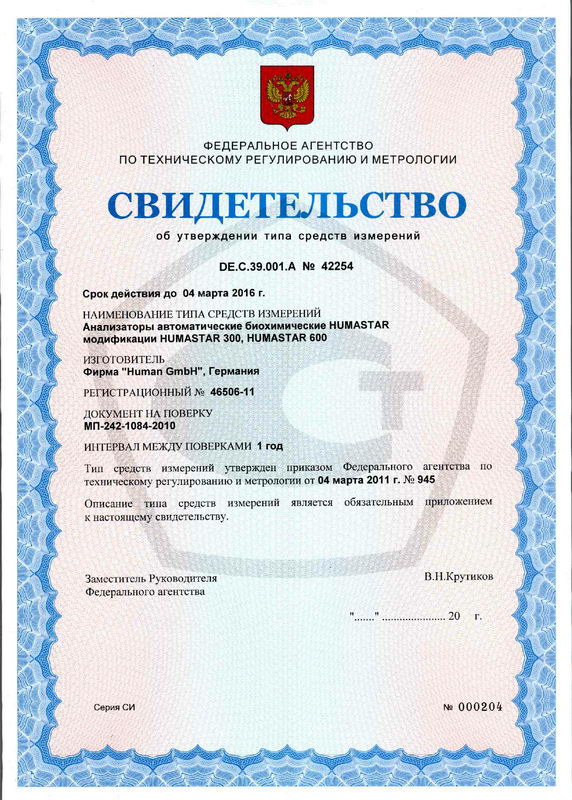 Поверка анализаторов биохимических автоматических HUMASTAR 300, HUMASTAR 600