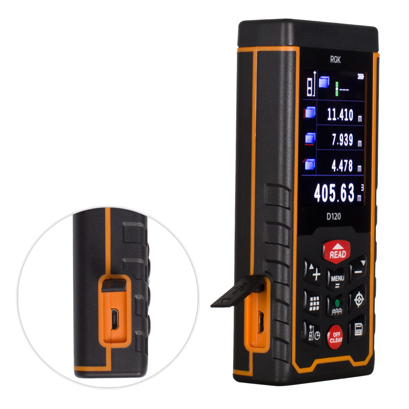 - Micro-USB — служит для загрузки сохранённых данных на ПК для последующей обработки в программе LDM Studio, поставляемой в комплекте с RGK D120. С помощью этой программы вы сможете мгновенно распечатать результаты измерений или выгрузить их в таблицу Excel. В таблице содержится информация обо всех замерах и результатах вычислений, а также о промежуточных значениях при подсчёте площадей и объёмов.