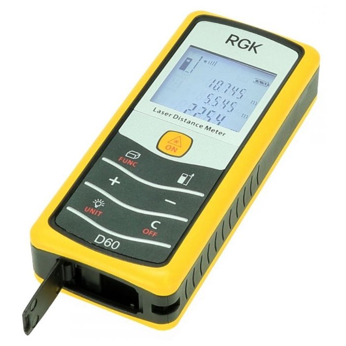 Благодаря наличию откидной скобы, лазерный дальномер RGK D60 позволяет измерять расстояние не только от верха или низа прибора, но и от угла, со стола или с другой плоской поверхности. Удобная панель управления с большими кнопками даёт доступ ко всем функциям лазерной рулетки. Трёхстрочный экран с подсветкой выводит всю необходимую в работе информацию: измеренное расстояние, активные функции и режимы измерения. Благодаря удачному дизайну RGK D60 отлично лежит в руке, вес и форма прибора обеспечивают комфорт в работе. Корпус лазерного дальномера надёжно защищает прибор от пыли и влаги, соответствуя стандарту защиты IP54.