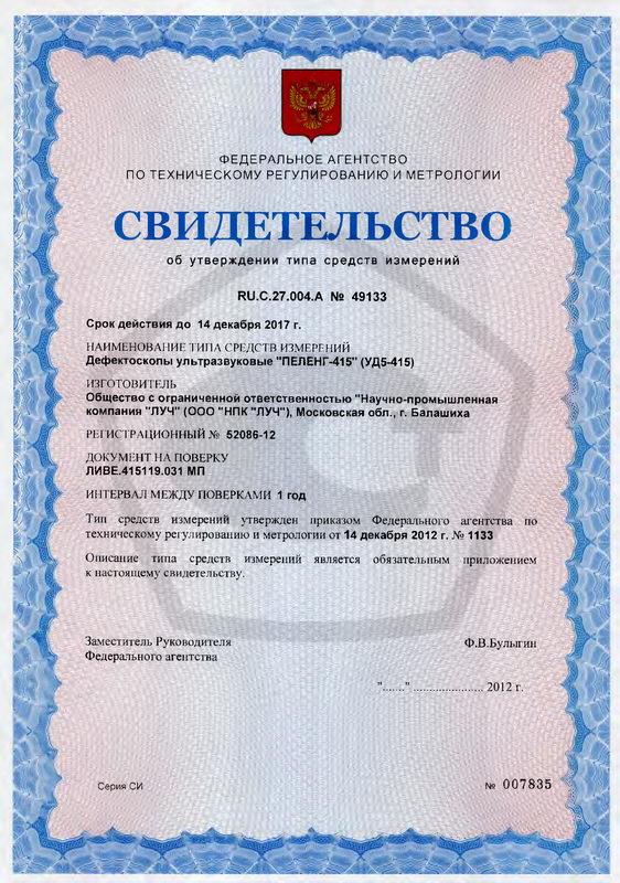 Дефектоскопы ультразвуковые «ПЕЛЕНГ-415» (УД5-415) (далее по тексту -дефектоскопы) переносные, ручные, общего назначения, предназначены для измерений глубины и координат залегания дефектов, контроля готовых изделий, полуфабрикатов и сварных (паяных) соединений на наличие дефектов типа нарушение сплошности и однородности материалов. Поверка дефектоскопа ультразвукового Пеленг-415 осуществляется в аккредитованной лаборатории и занимает от 1 до 5 дней.