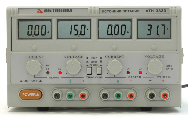 У трёхканальных источников питания два канала с регулируемыми выходными напряжением и током и один с фиксированным выходным напряжением. Двух- и трехканальные источники питания оснащены устройством, обеспечивающим работу двух регулируемых каналов в режиме последовательного или параллельного соединения для целей двукратного увеличения напряжения или тока соответственно . Ряд источников питания с одинаковыми выходными параметрами АТН-Х335 и АТН-Х336 отличаются типом цифровых индикаторов — жидкокристаллические или светодиодные.