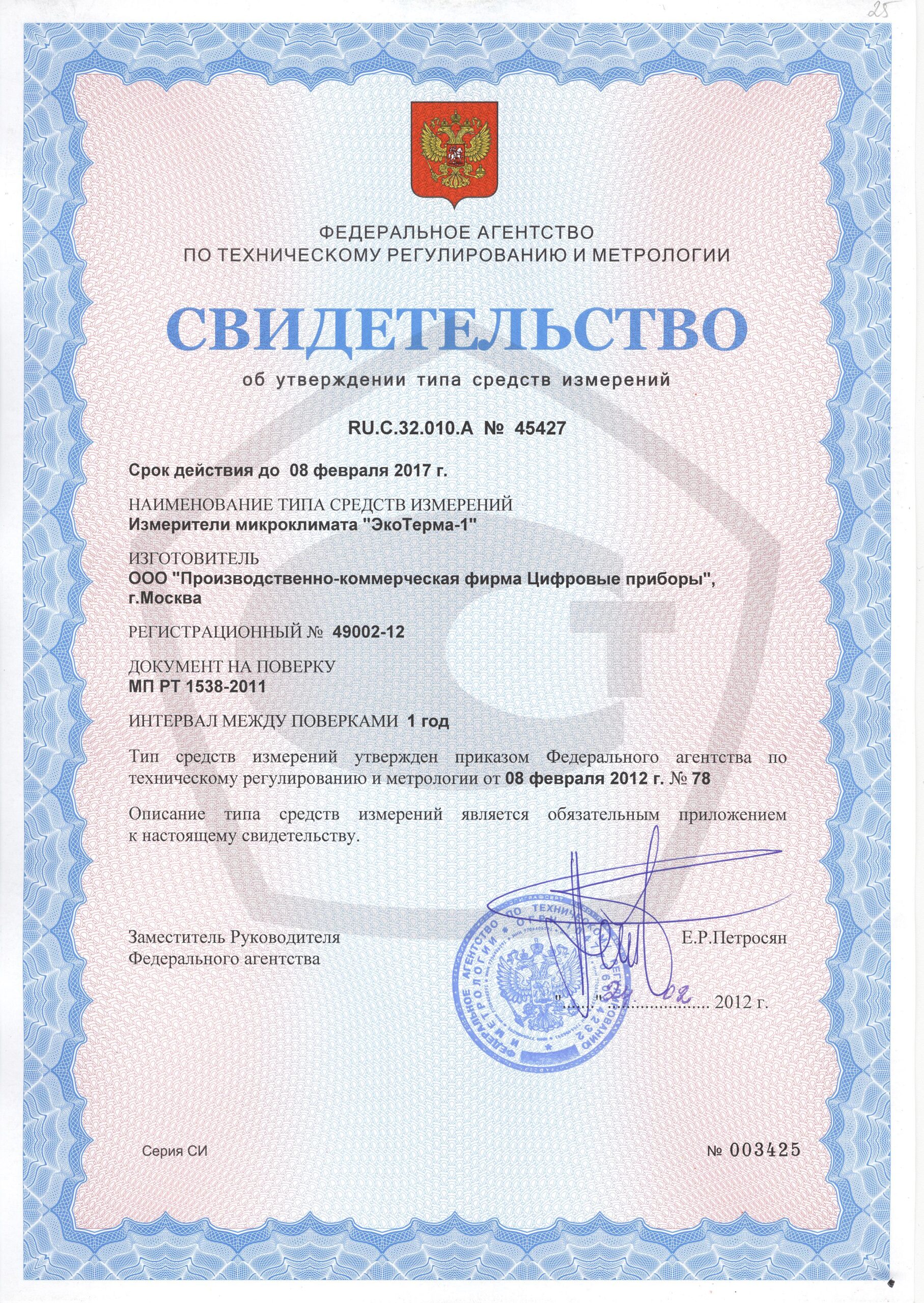 Поверка осуществляется по документу МП РТ 1538-2011 «Измерители микроклимата «Экотерма-1. Методика поверки», утвержденному ГЦИ СИ ФБУ «Ростест-Москва» 04 октября 2011 года.