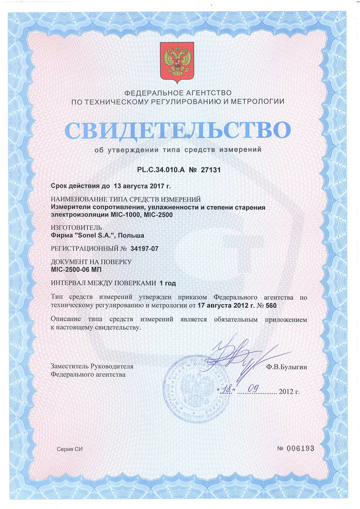 Поверка проводится в соответствии с документом: «Измерители сопротивления, увлажненности и степени старения электроизоляции MIC-1000, MIC-2500. Методика поверки MIC-2500-06 МП» согласованным с ГЦИ СИ ФБУ «Ростест-Москва» в 07 августа 2006 года и входящим в комплект поставки.