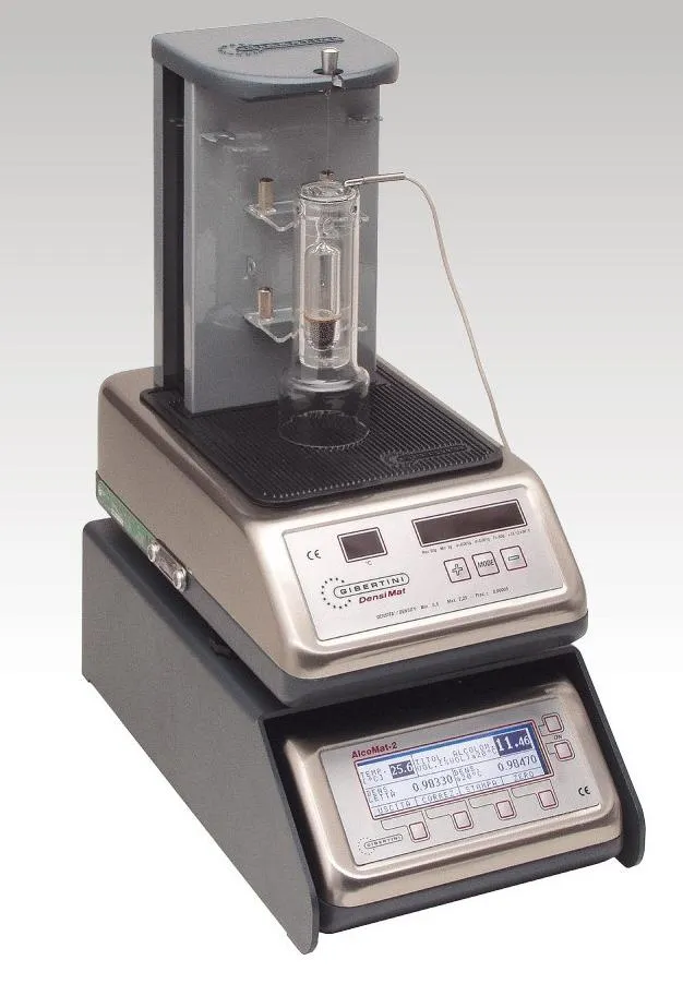 Измеритель относительной плотности жидкостей «Densimat» состоит из электронных гидростатических весов «Densimat», датчика температуры, стеклянного поплавка, калиброванного по весу и объему, и электронного модуля «Alcomat 2». Определение плотности жидкости производится взвешиванием в этой жидкости поплавка. Вес поплавка будет зависеть от плотности и температуры жидкости. По величине изменения веса поплавка в жидкости относительно его веса в воздухе определяется плотность жидкости. Электронный модуль «Alcomat 2» предназначен для автоматизации измерений объемного содержания спирта в водно-спиртовых растворах. На дисплей выводятся следующие данные: