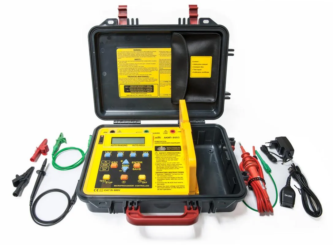 АКИП-8603 — Высоковольтный измеритель сопротивления изоляции (испытательное напряжение до 15 кВ с шагом регулировки 500 В) предназначен для измерения сопротивления изоляции оболочек электрических кабелей, проводов и других объектов в диапазоне 0,001 ГОм…3 ТОм (погрешность ± 5%). Тестер изоляции обеспечивает автоматическое измерение коэф. абсорбции (DAR), коэф. поляризации (PI) при постоянном напряжении (тест по таймеру). Для теста изоляции используется динамический режим генерации выходного тока с технологией авторегулирования диапазона. Тераомметр АКИП-8603 питается от аккумуляторной перезаряжаемой батареи и может быть использован для портативного тестирования электрической изоляции материалов, диэлектриков (исследуемых устройств/ ИУ). Поверка измерителя сопротивления изоляции АКИП-8602 осуществляется в аккредитованной лаборатории и занимает от 1 до 5 дней.