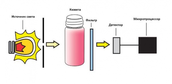 После добавления необходимого реагента к образцу, образец меняет цвет; чем больше концентрация, тем ярче окраска. Затем, полученное изменение цвета колориметрически анализируется в соответствии с законом Ламберта-Бера. Этот закон гласит, что свет поглощается дополнительным цветом, а испускаемое излучение зависит от концентрации. Для определения общей жесткости и содержания железа, узкий интерференционный фильтр с полосой при 525 нм (зеленый) пропускает к кремниевому фотоприемнику только зеленый свет и не пропускает остальной спектр видимого света испускаемый вольфрамовой лампой. Увеличение интенсивности цвета прореагировавшего образца приводит к увеличению абсорбции специфической длины волны света и уменьшению коэффициента пропускания.