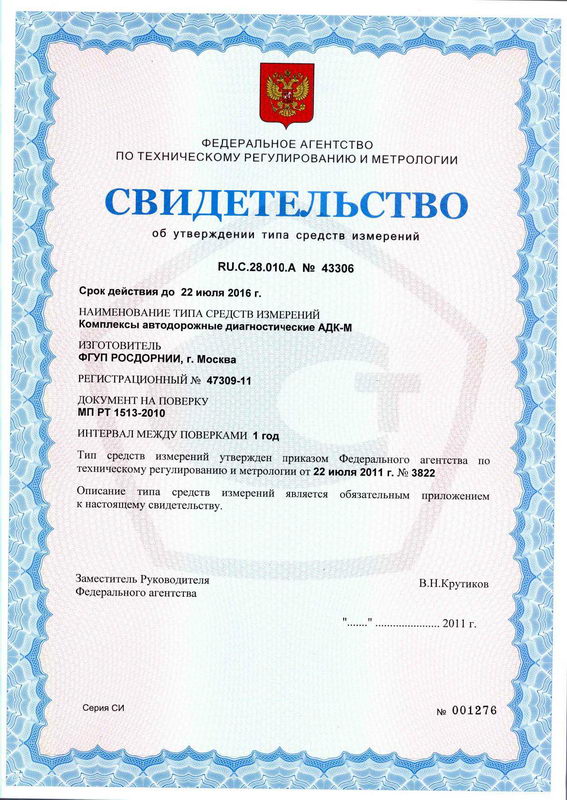 Поверка комплексов автодорожных диагностических АДК-М-1, АДК-М-2, АДК-М-3, АДК-М-4, АДК-М-5, АДК-М-6, АДК-М-7, АДК-М