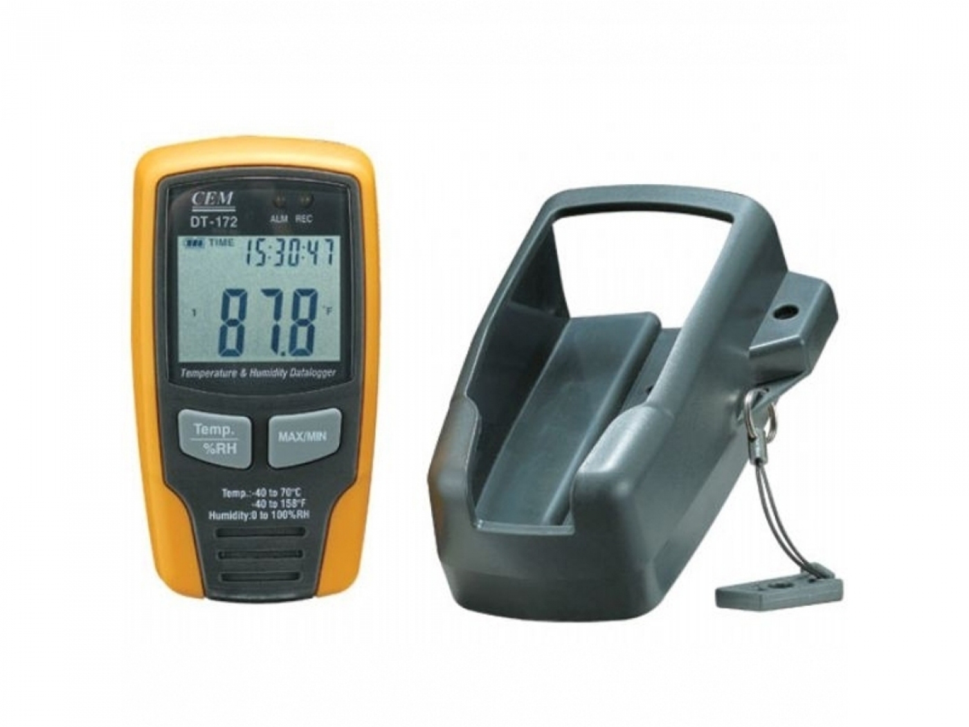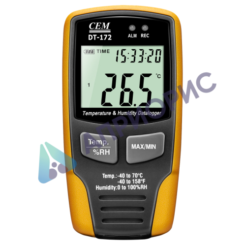 Прибор DT-172 производит измерения и сохраняет до 16350 значений относительной влажности и 16350 значений температуры в диапазоне от 0 до 100 % RH и от -40 до +70 °C. LCD дисплей может отображать максимальное и минимальное значения, текущие значения, знак тревоги.