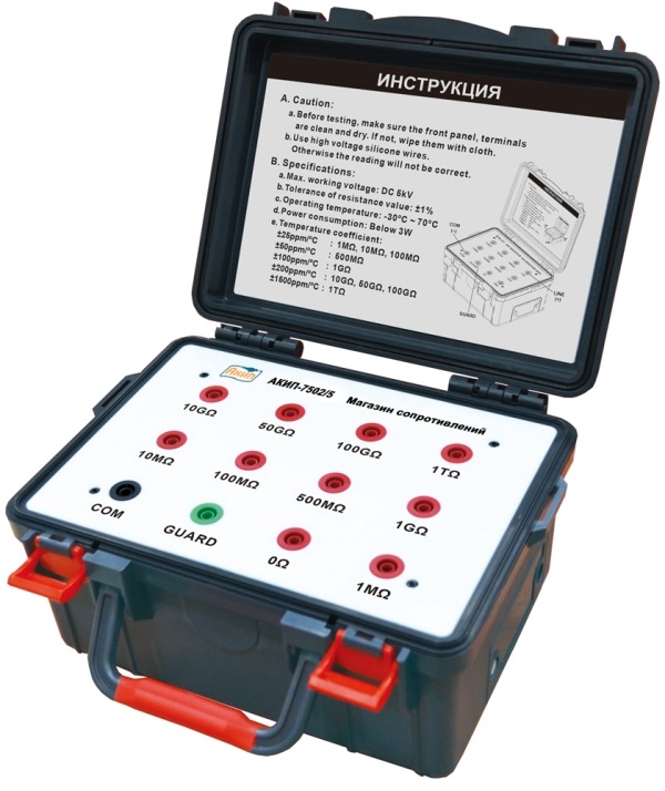 Магазины сопротивлений АКИП-7502/1, АКИП-7502/2, АКИП-7502/3 представляют собой наборы точных высокоомных высоковольтных резисторов и отличаются между собой их числом и номиналом. Конструктивно магазины размещены в переносных пластмассовых корпусах с откидной крышкой и ручками для переноски.