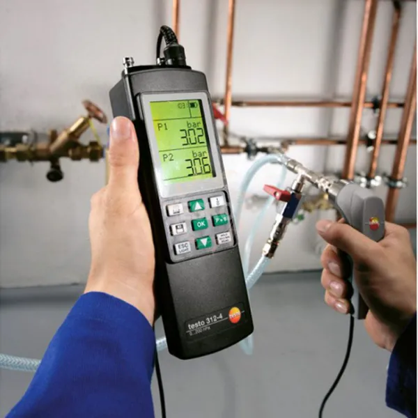 Пневматические испытания и проверка герметичности водопроводов с питьевой водой и канализационных водопроводов могут проводиться без затруднений с использованием зонда высокого давления. Внешний зонд обеспечивает надёжную защиту измерительного инструмента от воды и высоких давлений. Меню манометра Тэсто очень удобно и понятно в управлении, что играет не посленюю роль в облегчении работы. Регистрация измеренных данных осуществляется на протяжении заданного времени, например, 24 часа и последующая их передача на ПК для анализа с помощью ПО «Easyheat». Модели манометра Testo 312 внесены в Государственный Реестр СИ РФ под номером 47453-11.