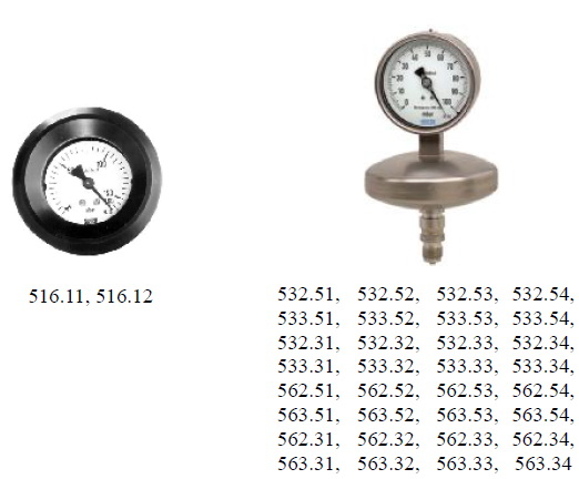 - Манометры модификаций 563.51, 563.52, 563.53, 563.54, 563.31, 563.32, 563.33, 563.34 имеют гидрозаполненный корпус.
