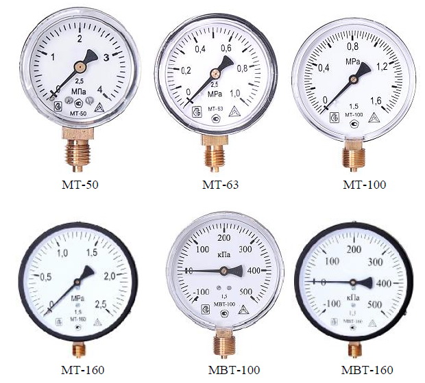 Модификации: манометр МТ-160, МТ-100, МТ-63, МТ-50, мановакуумметр МВТ-100, МВТ-160.