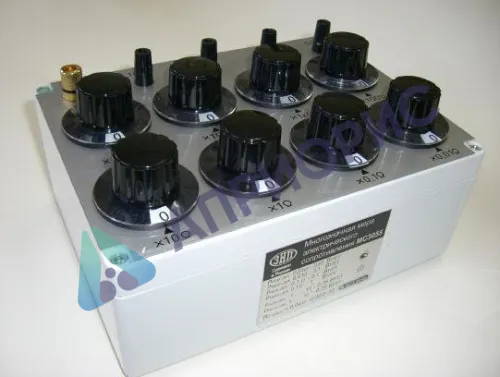 Мера электрического сопротивления многозначная типа МС 3055 (далее ММЭС), выполнена в унифицированном пластмассовом корпусе, внутри которого расположены 8 резистивных декад сопротивлений и 8 переключателей резистивных декад, позволяющих производить коммутацию различных значении сопротивлений.