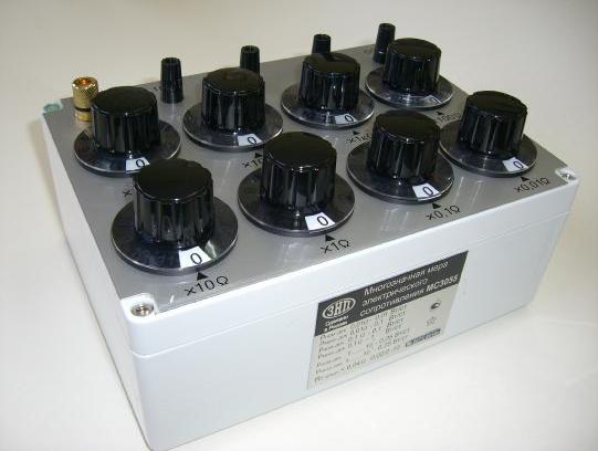 Мера электрического сопротивления многозначная типа МС 3055 (далее ММЭС), выполнена в унифицированном пластмассовом корпусе, внутри которого расположены 8 резистивных декад сопротивлений и 8 переключателей резистивных декад, позволяющих производить коммутацию различных значении сопротивлений.