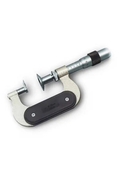 Микрометр представляет собой скобу, в которую слева запрессована пятка со срезанной тарельчатой измерительной поверхностью, а справа — микрометрическая головка с губкой, крепящейся в торце микрометрического винта и имеющей тарельчатую измерительную поверхность.