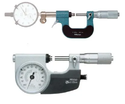У микрометров рычажных серии 523 «пар» на продолжении неподвижной измерительной пятки расположена цифровая измерительная головка, имеющая кнопки, с помощью которых осуществляется ряд специальных функций (например, кнопка включения/выключения экрана (ON/OFF), возможность обнуления показаний (ZERO/АВ5) и т. д. У микрометров рычажных серии 523 «Dia1 пар» на скобе расположена круговая шкала, по которой производится отсчет показаний.