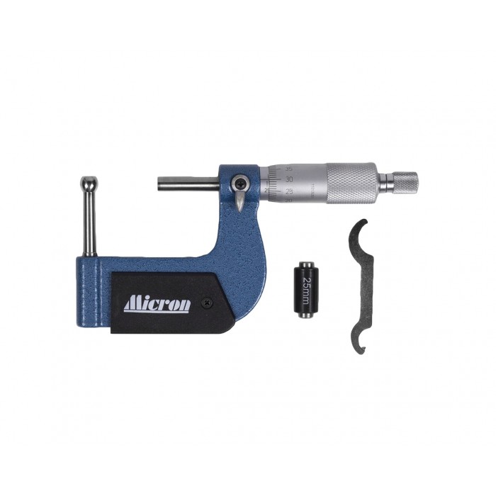 Принцип действия механический. Микрометр представляет собой скобу, в которую слева запрессована пятка со сферической измерительной поверхностью, а справа микрометрическая головка.