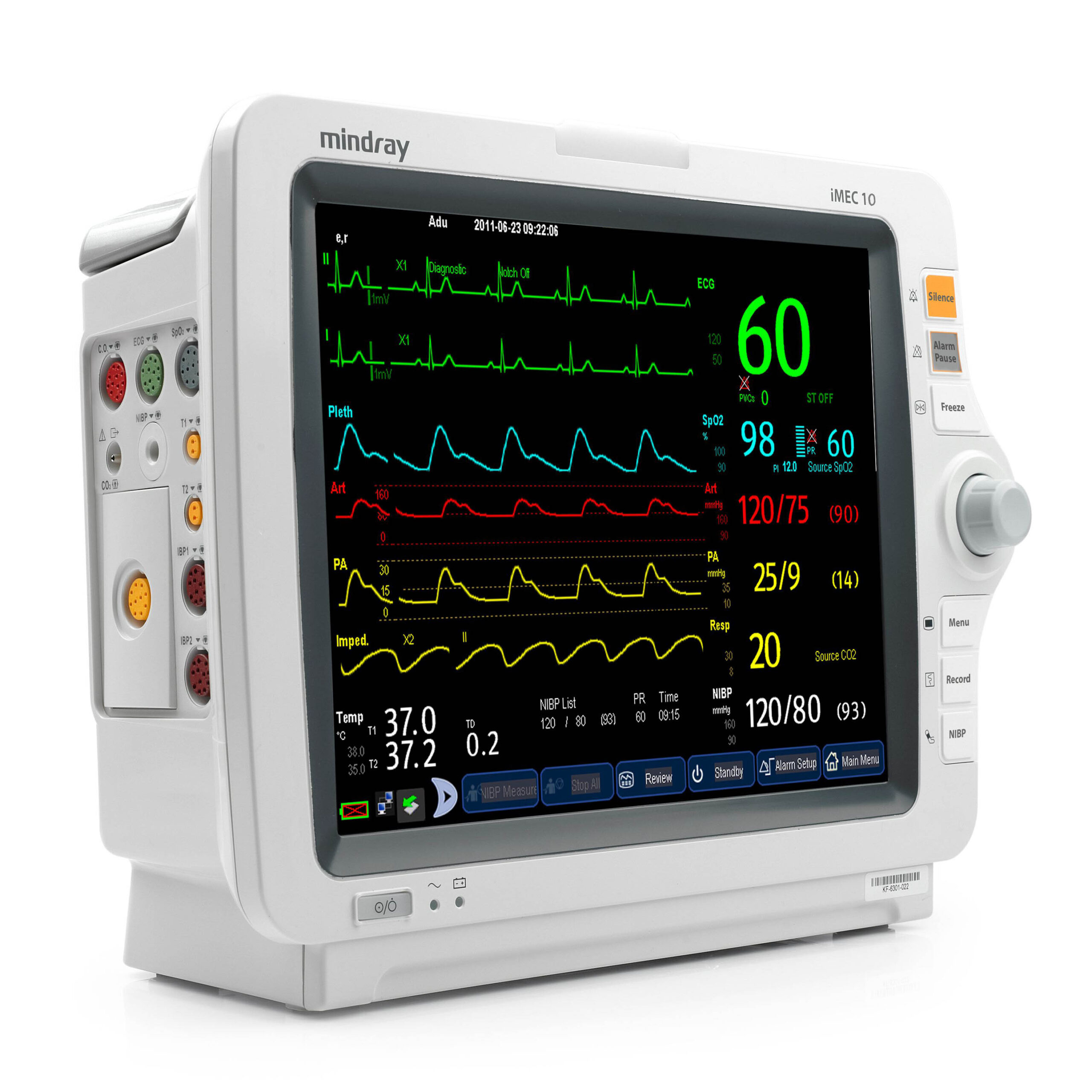 Монитор имеет цветной ЖК-дисплей, на котором могут одновременно отображаться измеряемые показатели, сигналы в виде колебаний и информация о тревожных сигналах, номер постели больного, состояние монитора пациента, время и другая информация с монитора пациента. Основной экран поделен на 3 области: информационная область, область диаграмм, область цифровых значений, область меню
