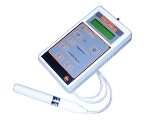 Принцип действия нитратомера основан на измерении разности потенциалов (ЭДС) между электродом измерительным и электродом сравнения в составе комбинированного нитрат—селективного электрода, возникающей при его контакте с водной средой, содержащей нитрат—ионы, и преобразовании этой ЭДС в значения pNO3 и С 0. Нитратомер состоит из измерительного преобразователя (ИП) и комбинированного нитрат—селективного электрода.