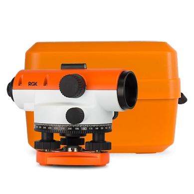 Стандартная комплектация: оптический нивелир RGK C-20, нитяной отвес, юстировочный набор, руководство по эксплуатации, транспортировочный кейс.