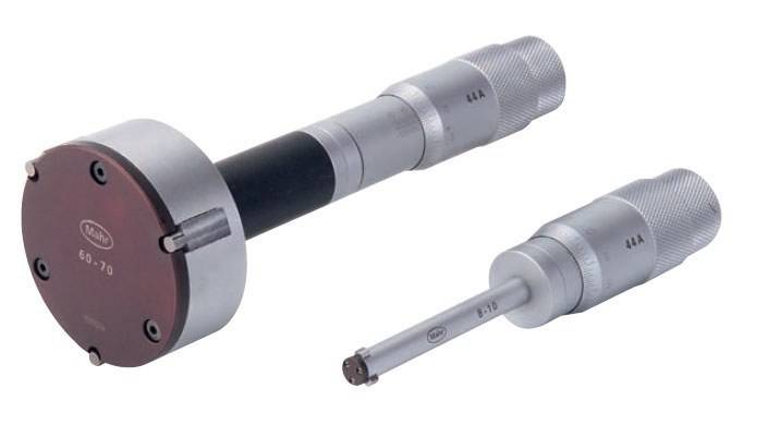 Нутромеры 44А состоят из микрометрической головки и съемной самоцентрирующейся измерительной головки с тремя боковыми развернутыми на 120° измерительными щупами. Микрометрическая головка представляет собой стебель, в котором закреплена резьбовая гайка. Для учета осевого перемещения микровинта в целых оборотах служит продольная шкала, интервал деления которой равен шагу микровинта, указателем для отсчета по этой шкале является торец барабана, закрепленного на микровинте. Для отсчета долей оборота микровинта служит круговая шкала (нониус) с радиальными штрихами, нанесенными на конусной части барабана микрометра. Шкалы на барабане и стебле хромированы. Для обеспечения постоянства измерительного усилия нутромеры снабжены специальным механизмом, отрегулированным на определенное усилие поворота или проскальзывания.