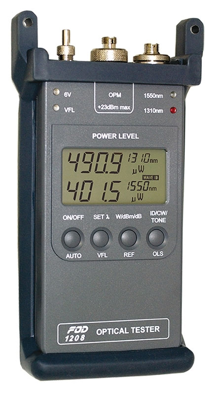 Оптический тестер ЕОГ — 1208 включает измеритель оптической мощности (измеритель) со встроенным источником излучения (источник) на длину волны 1,31; 1,55 мкм и визуализатором повреждений на длине волны 650 нм . Принцип действия измерителя мощности основан на преобразовании фотоприемником оптического сигнала в электрический с последующим усилением и преобразованием в цифровую форму . Источник оптического излучения основан на полупроводниковых лазерах.