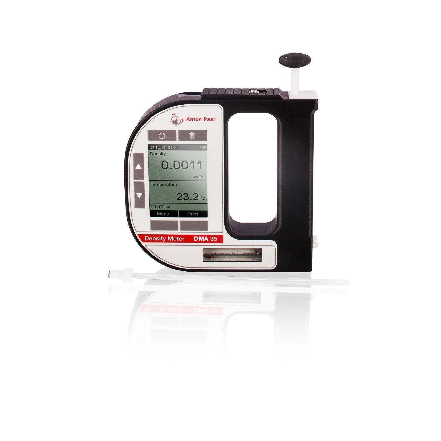 Чувствительный элемент, термометр сопротивления, электронный блок, жидкокристаллический дисплей, сменные элементы питания, механический поршневой насос для подачи жидкости в чувствительный элемент и пробозаборное устройство в виде трубки из химостойкого пластика размещены в едином корпусе. В момент выполнения измерений плотномер DMA 35 находится в руках оператора, пробозаборное устройство погружается в емкость с отобранной пробой жидкости для измерений. Механический поршневой насос приводится в действие нажатием пальца оператора и жидкость из емкости подается в чувствительный элемент. Измерения плотности и температуры жидкости выполняются плотномером автоматически. Результаты измерений плотности и текущей температуры жидкости выводятся на монохромный жидкокристаллический дисплей плотномера.