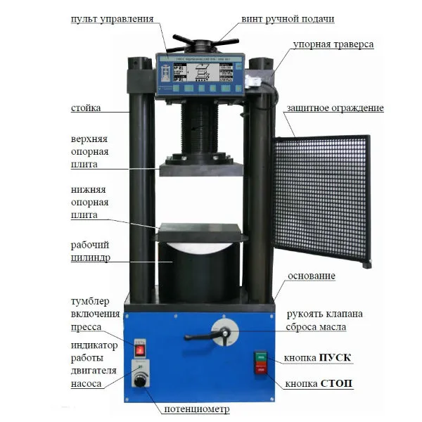 Индикация результатов испытаний цифровая (графический дисплей с подсветкой). Ввод исходных данных (вид материала, размеры образца, скорость нагружения) осуществляется в диалоговом режиме с пульта управления.