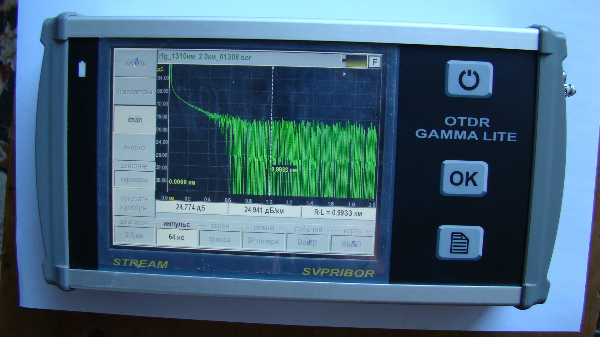 *Режим «Автоизмерение» — облегченная версия OTDR – достаточно нажать одну кнопку. Рефлектометр ГАММА-ЛАЙТ сам выставит нужные параметры, проведет измерения и покажет рефлектограмму с автоматическим анализом трассы (линии).