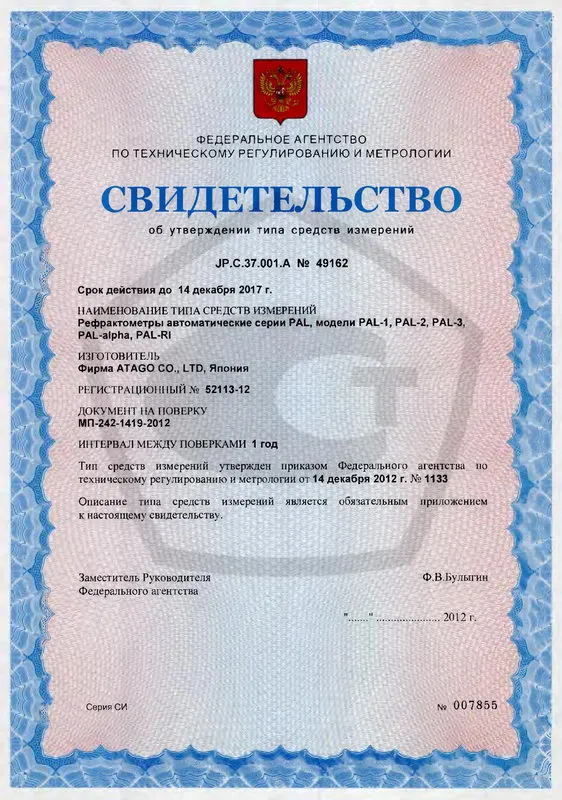 Поверка осуществляется по документу МП-242-1419-2012 «Рефрактометры автоматические серии PAL, модели PAL-1, PAL-2, PAL-3, PAL-alpha, PAL-RI. Методика поверки», утвержденному ГЦИ СИ ФГУП «ВНИИМ им. Д. И. Менделеева» в октябре 2012 г.