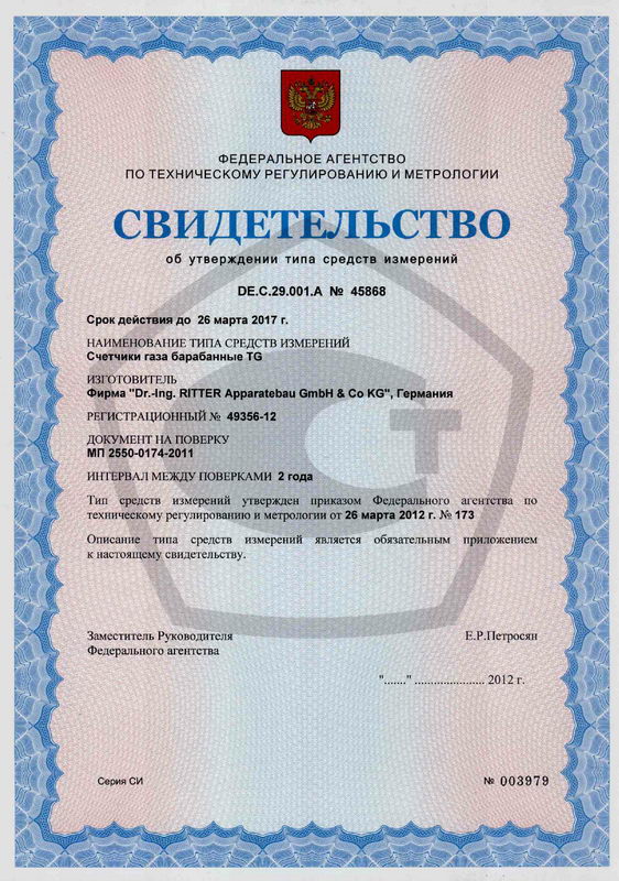 Поверка осуществляется по МП-2550-0174-2011 «Счетчики газа барабанные TG. Методика поверки», утвержденной ГЦИ СИ ФГУП «ВНИИМ им. Д.И. Менделеева» 18.11.2011 г.