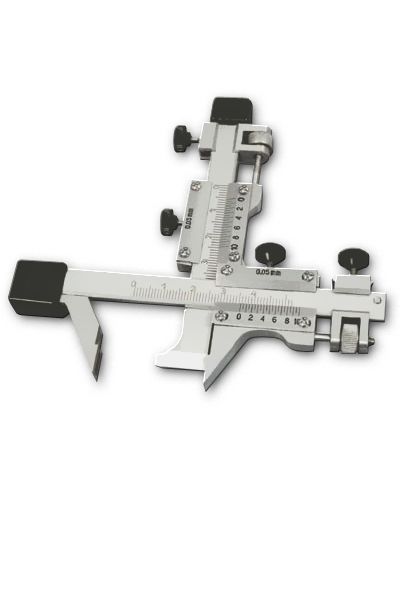 В рамке с неподвижной губкой в двух взаимно перпендикулярных пазах перемещается штанга с губкой и высотная линейка. На штанге нанесена горизонтальная миллиметровая шкала, на высотной линейке — вертикальная.