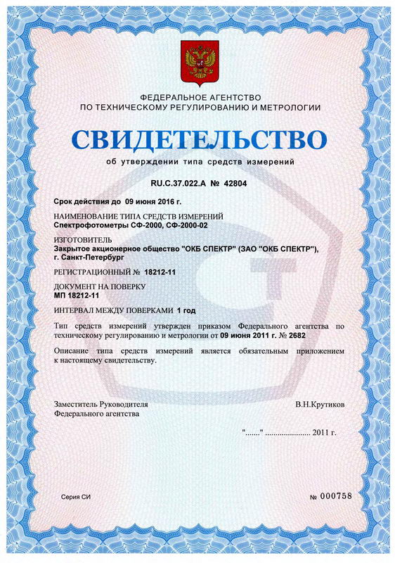 - Раздел 5 «Методика поверки» Руководства по эксплуатации «СпектрофотометрыСФ-2000 и СФ-2000-02», утвержденной ГЦИ СИ ФГУ «Тест-С.-Петербург» 06.04.2011 г